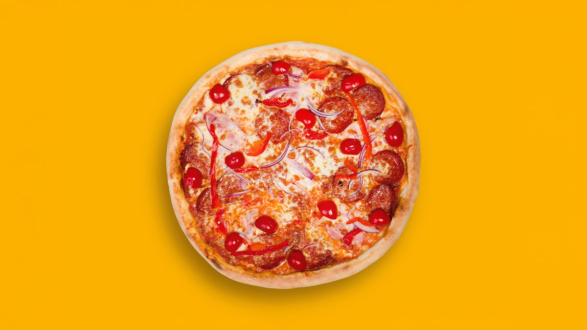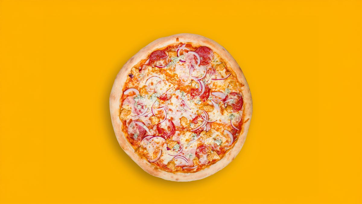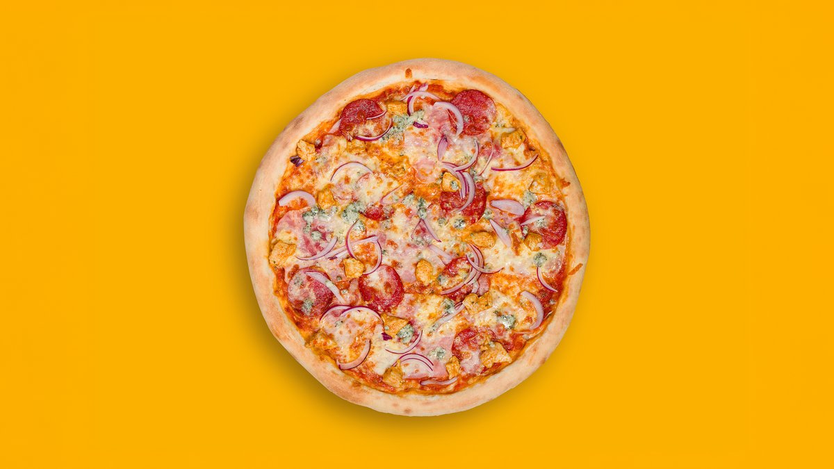 pomodoro, mozzarella, kuřecí maso, šunka, slanina, salám, cibule, niva. alergeny (1,3,7)