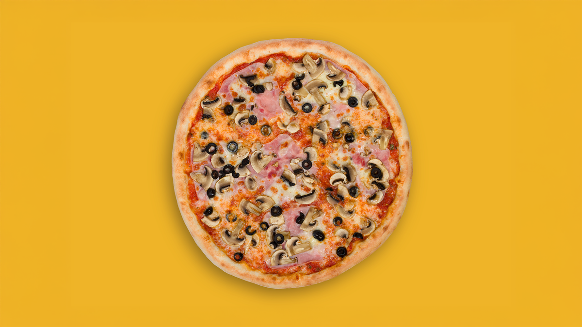 tomato, mozzarella, šunka, žampiony, olivy (1,3,7)
