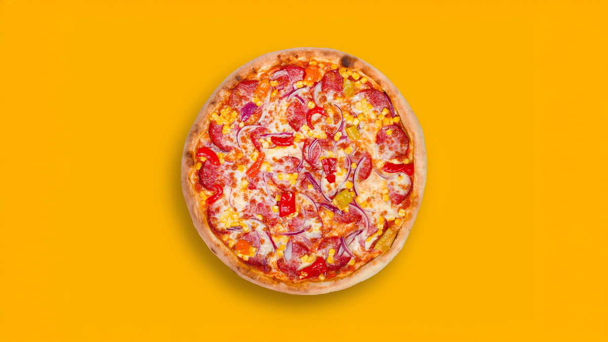 tomato, mozzarella, salám, cibule, kukuřice, kozí rohy (1,3,7)
