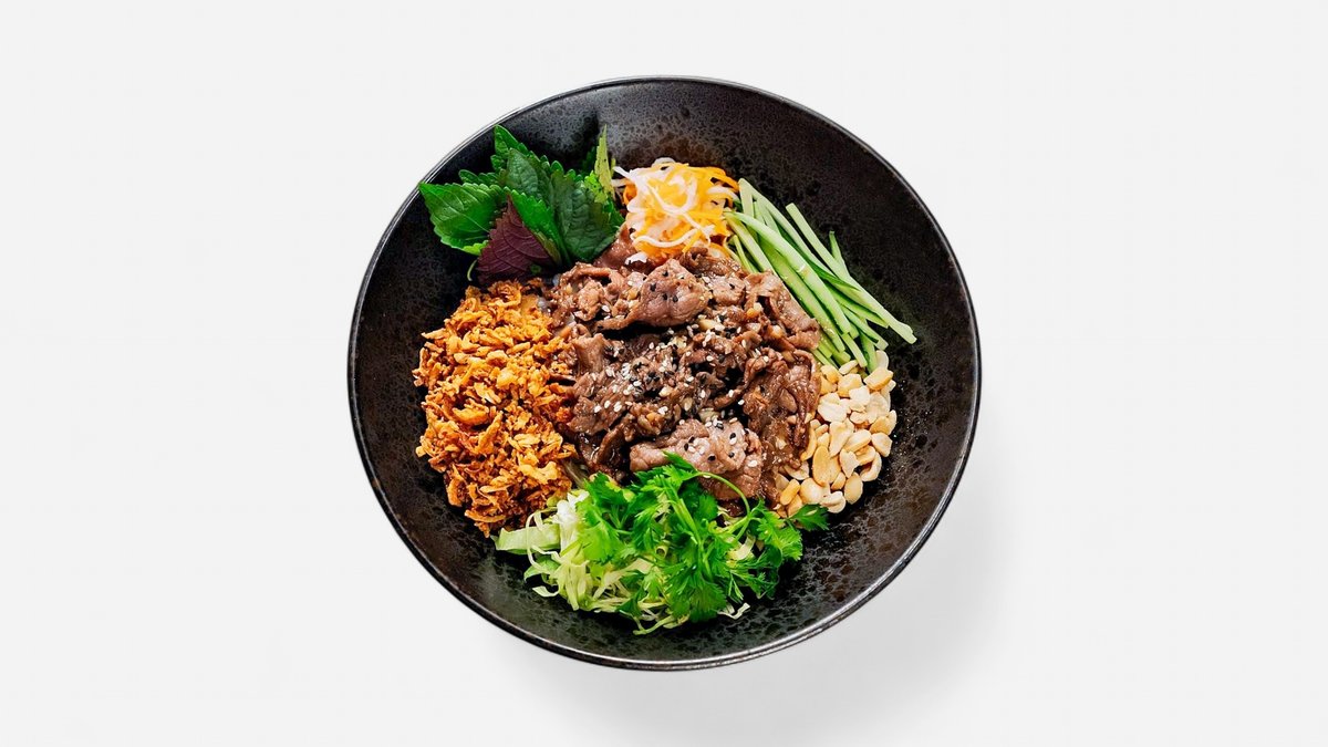 Hovězí, rýžové nudle, mrkev, okurka, salát, arašídy, smažená cibulka, rybí zálivka / Beef, rice noodles, carrot, cucumber, peanuts, fried onion, fish sauce