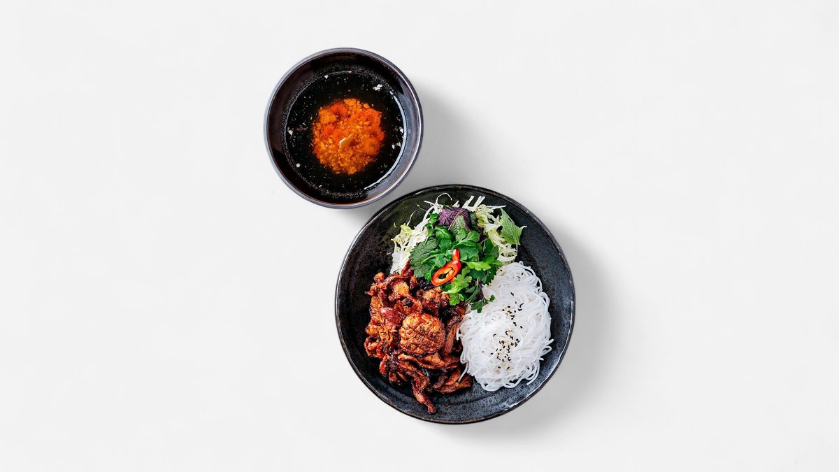 Grilovaný bůček, rýžové nudle, salát, bylinky, rybí omáčka / Grilled pork belly, rice noodles, salad, herbs, fish sauce
