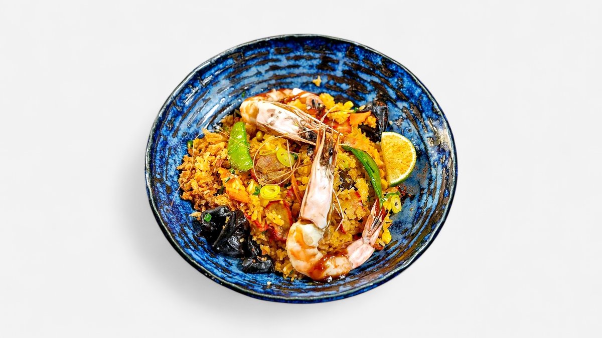 Marinovaná krkovice, tygří krevety, restovaná rýže, vejce, mrkev, jidášovo ucho, císařský hrášek, smažená cibulka / Marinated pork, tiger-shrimps, stir-fried rice, egg, carrot, wood eat, flat green beans, fried onion
