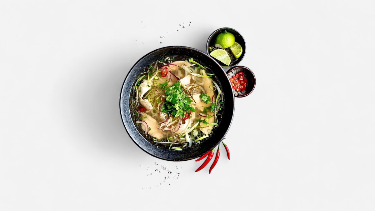 Pho vývar, kuřecí, ploché rýžové nudle, cibule, bylinky / Pho broth, chicken, flat rice noodles, onion, herbs