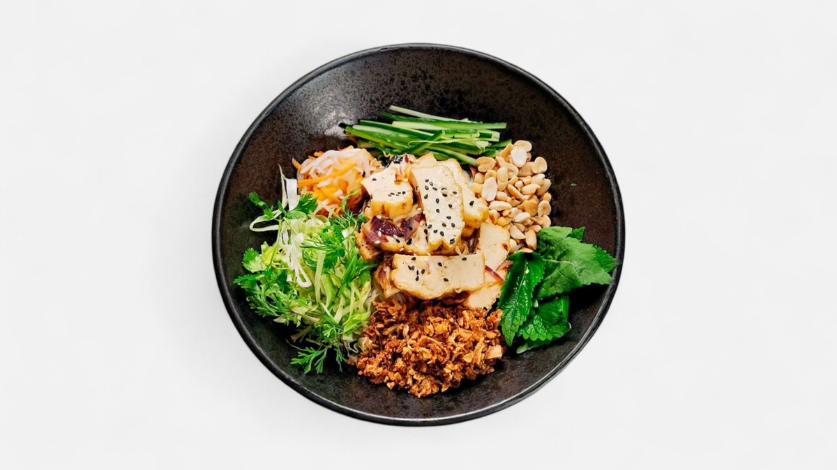 Tofu, rýžové nudle, mrkev, okurka, salát, arašídy, smažená cibulka, sojová omáčka / Tofu, rice noodles, carrot, cucumber, salad, peanuts, fried onion, soy sauce