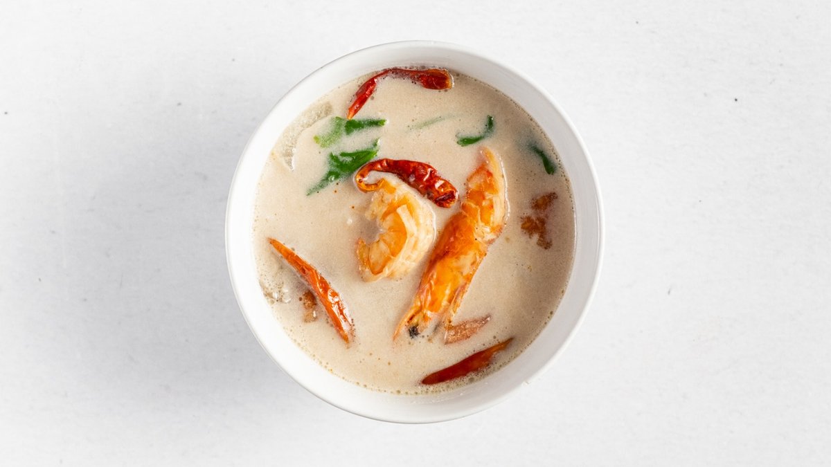 Pikantní polévka (300 ml) s krevetami, kokosovým mlékem, hlívou ústřičnou, galangalem, citronovou trávou a kafírovými lístky.