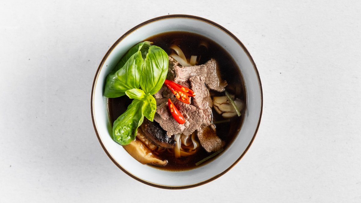 Velká polévka (800 ml) s hovězím masem, s rýžovými nudlemi, čerstvou zeleninou, jarní cibulkou, osmaženým česnekem, sojovými klíčky a koriandrem.