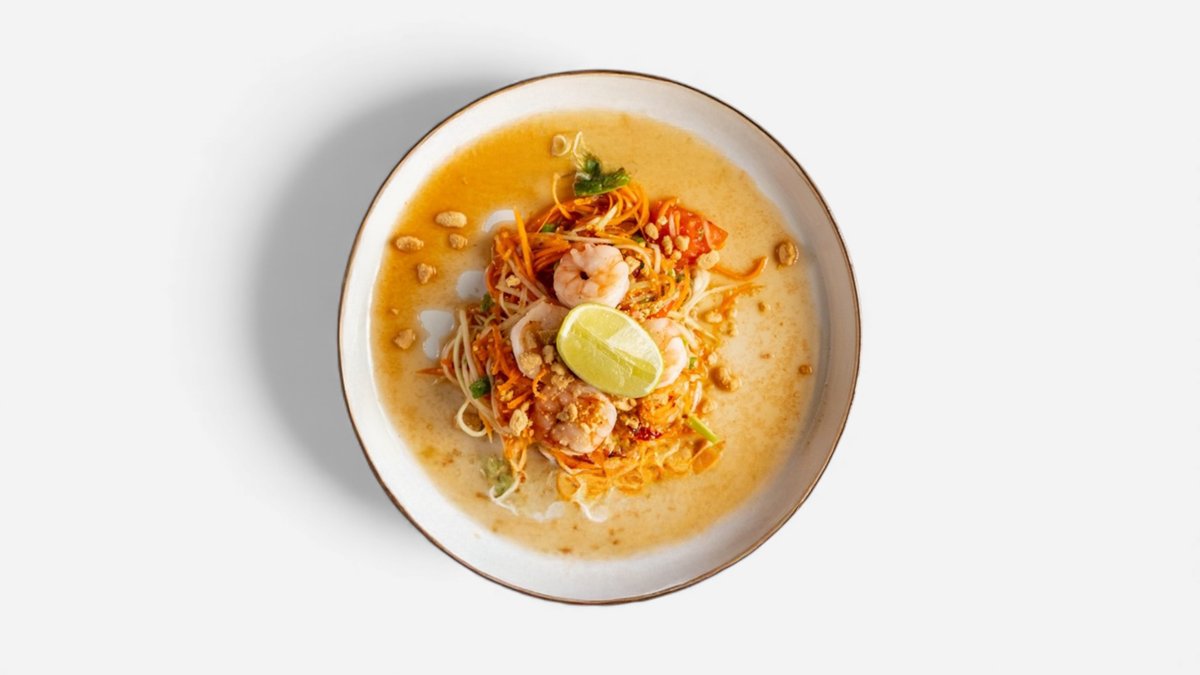 Kuřecí maso se žlutými nudlemi z oblasti Chiang Mai, s koriandrem a palmovým cukrem.
