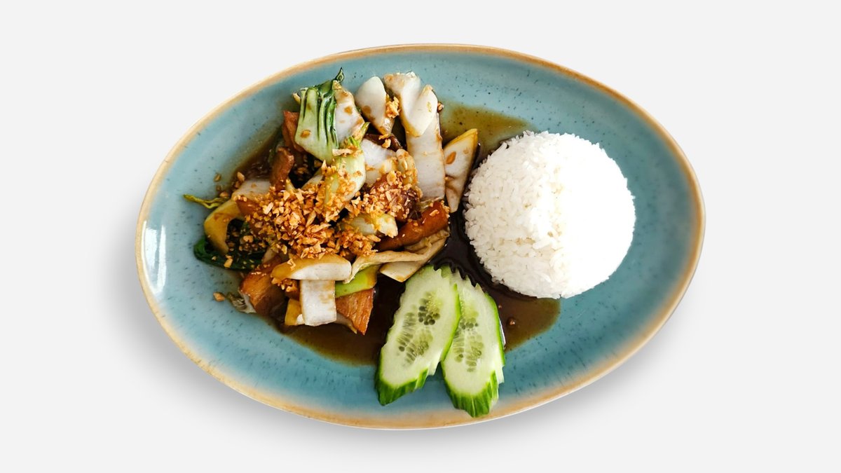Pečený vepřový bůček restovaný na česneku s ústřicovou omáčkou a bok choi s jasmínovou rýží. Grilled pork belly stir fried in oyster sauce with garlic and bok choi, jasmine rice.