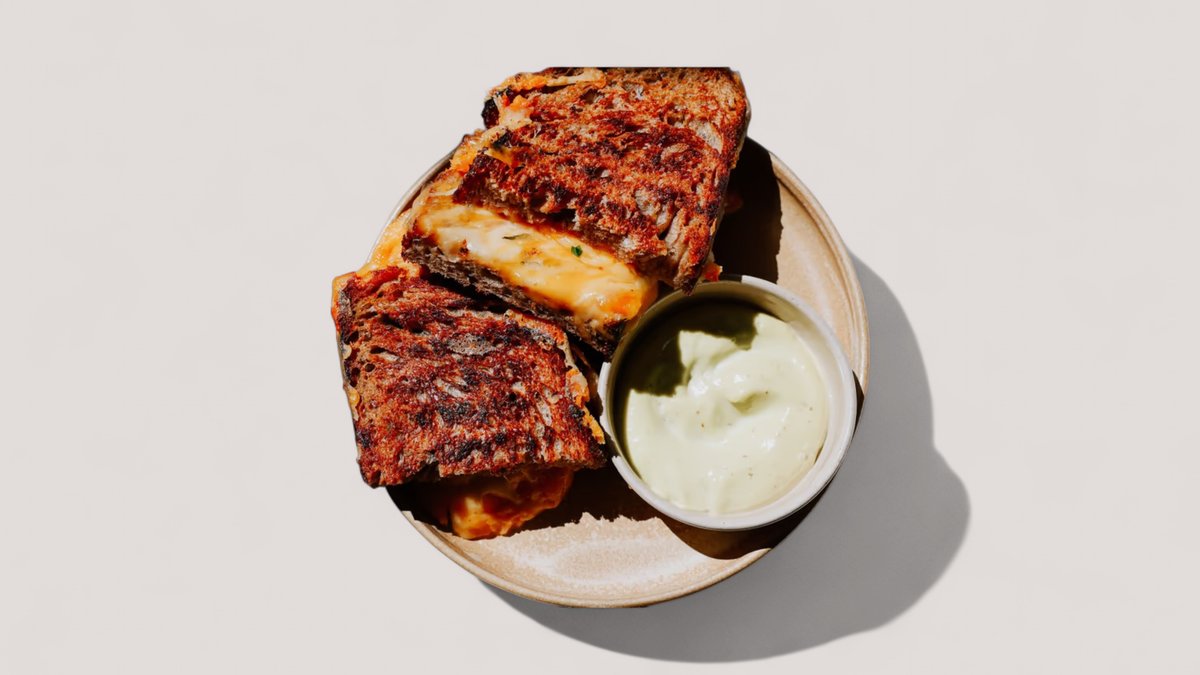 Zapečený chleba, vyzrálý sýr, kimchi z ředkviček a kedlubny, majonéza