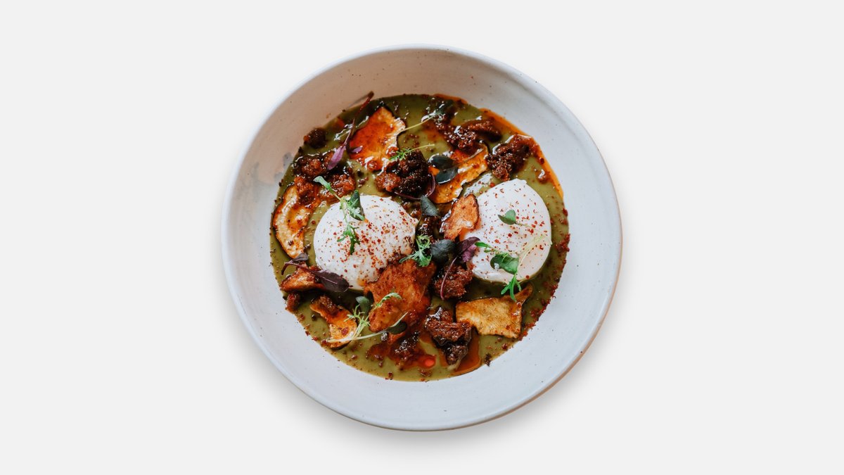 Zastřená vejce, hrachový krém na víně, chips z topinamburu, krutony z našeho chleba, miso omáčka s rakytníkem a chilli
