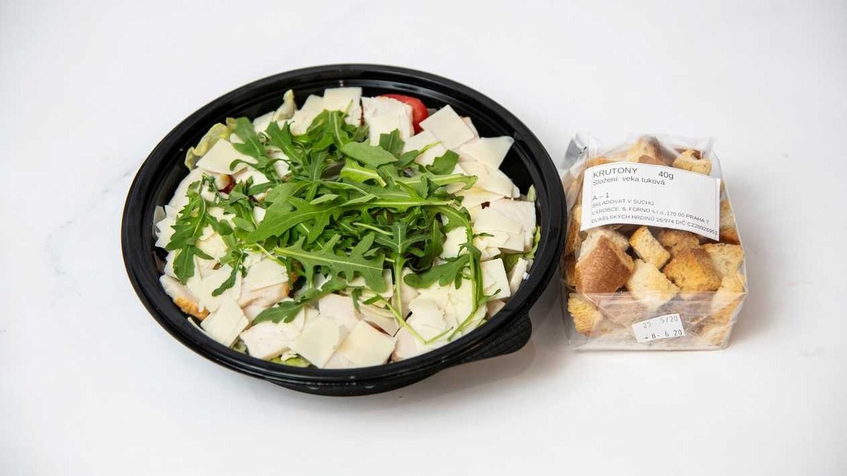 300g - římský salát, kuřecí maso, paprika, cherry rajčátka, parmazán, krutony, domácí dresink caesar, rukola (nelze měnit, odebírat ani přidávat ingredience)
