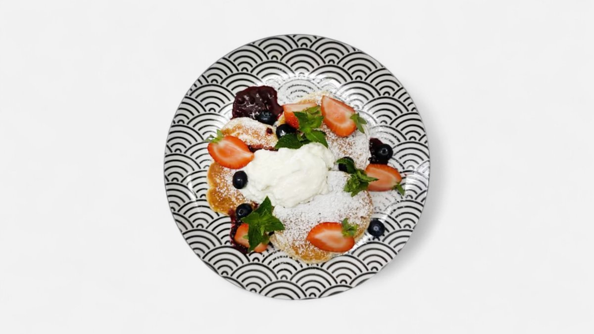 3 lívance, směs ovoce, sladký tvaroh