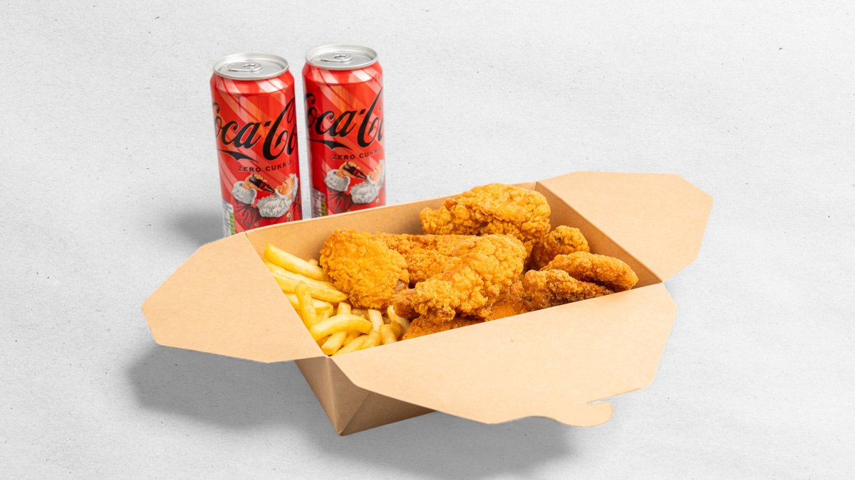5× strips; 5× křídla; Hranolky 200 g; 2× omáčky; 1× cola