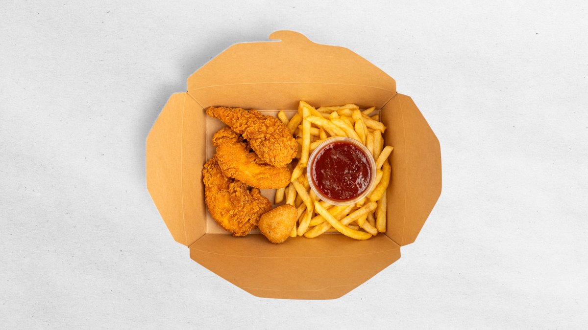 3× kuřecí strips; Hranolky 150 g; 1× omáčka; 1× chilli cheese nugget
