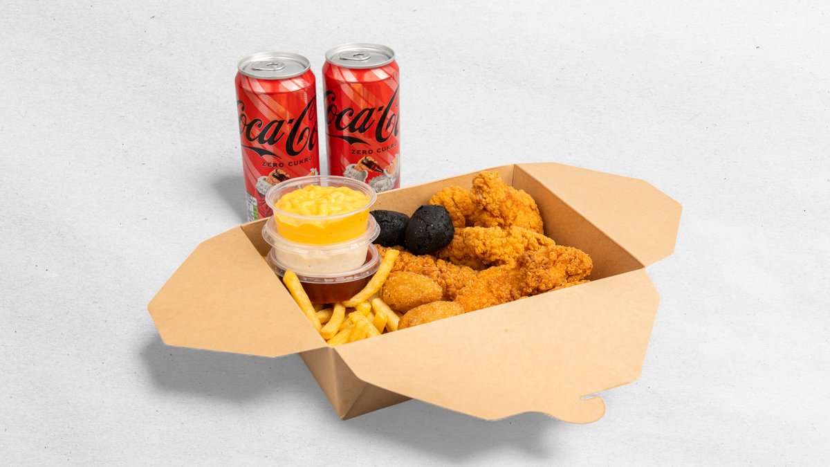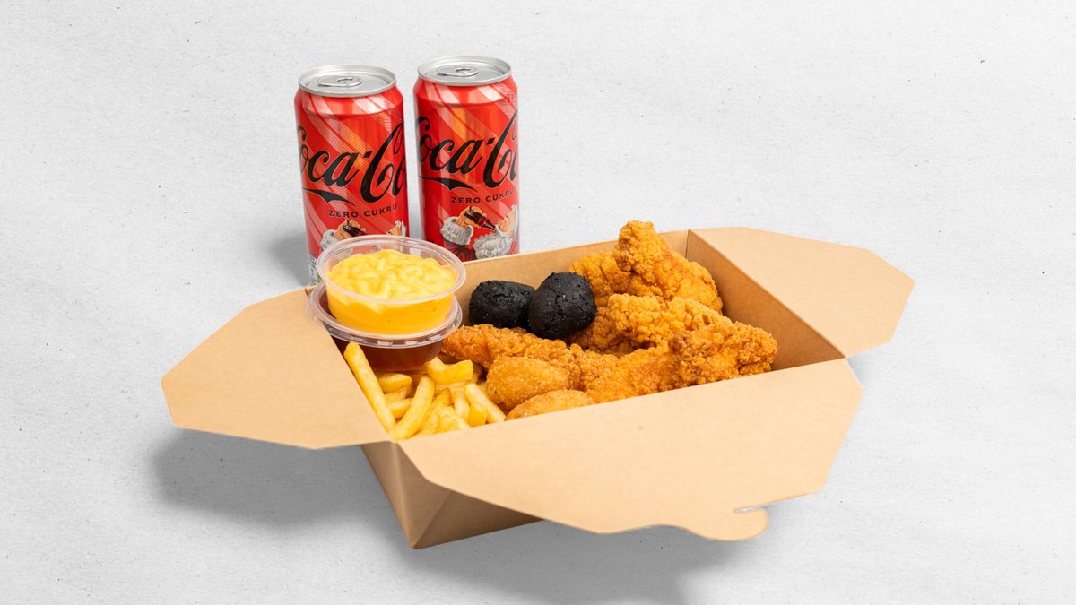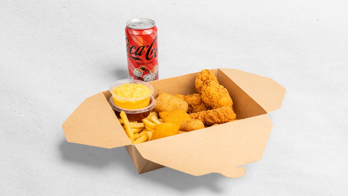 3× strips; 3× křídla; 2× chilli nugget; 2× sýrové polštářky; 1× jalapeño sýr; Hranolky 150 g; 2× omáčky; 1× cola 0,33 l