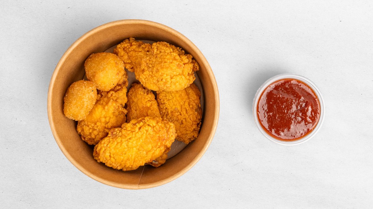 5× kuřecí křídla; 2× chilli cheese nugget; 1× omáčka