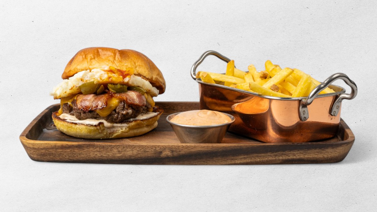 hovězí maso, máslová brioška, majonéza, slanina, čedar, jalapeňos papričky, volské oko, naše barbeque omáčka (180g)