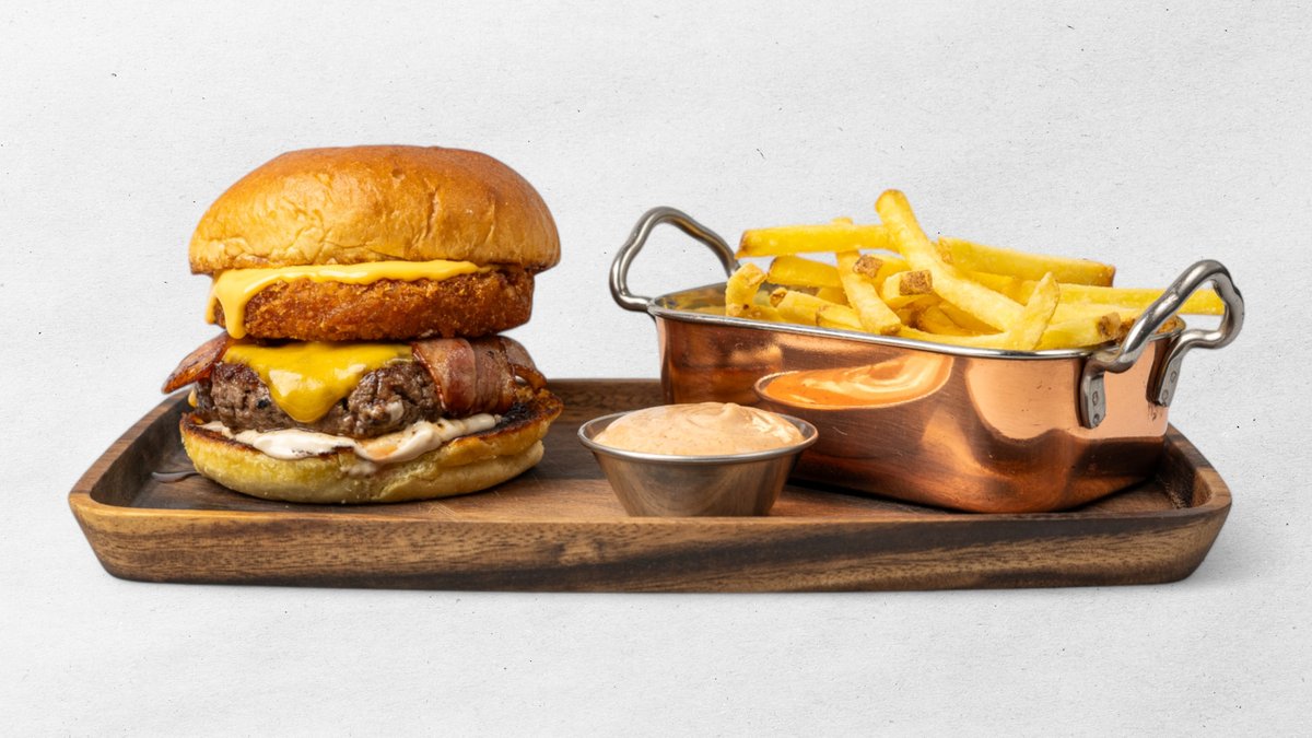 180 g hovězího masa, máslová brioška, sýrová majonéza, bramborová placka, cheddar, slanina, naše speciální sýrová omáčka, hranolky a náš grilovací dip