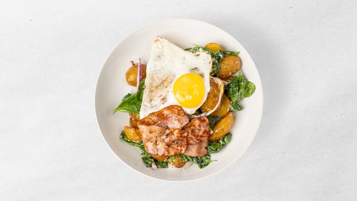 pečené brambůrky ve slupce, anglická slanina, volské oko, baby špenát, červená cibule, česnekový dresing