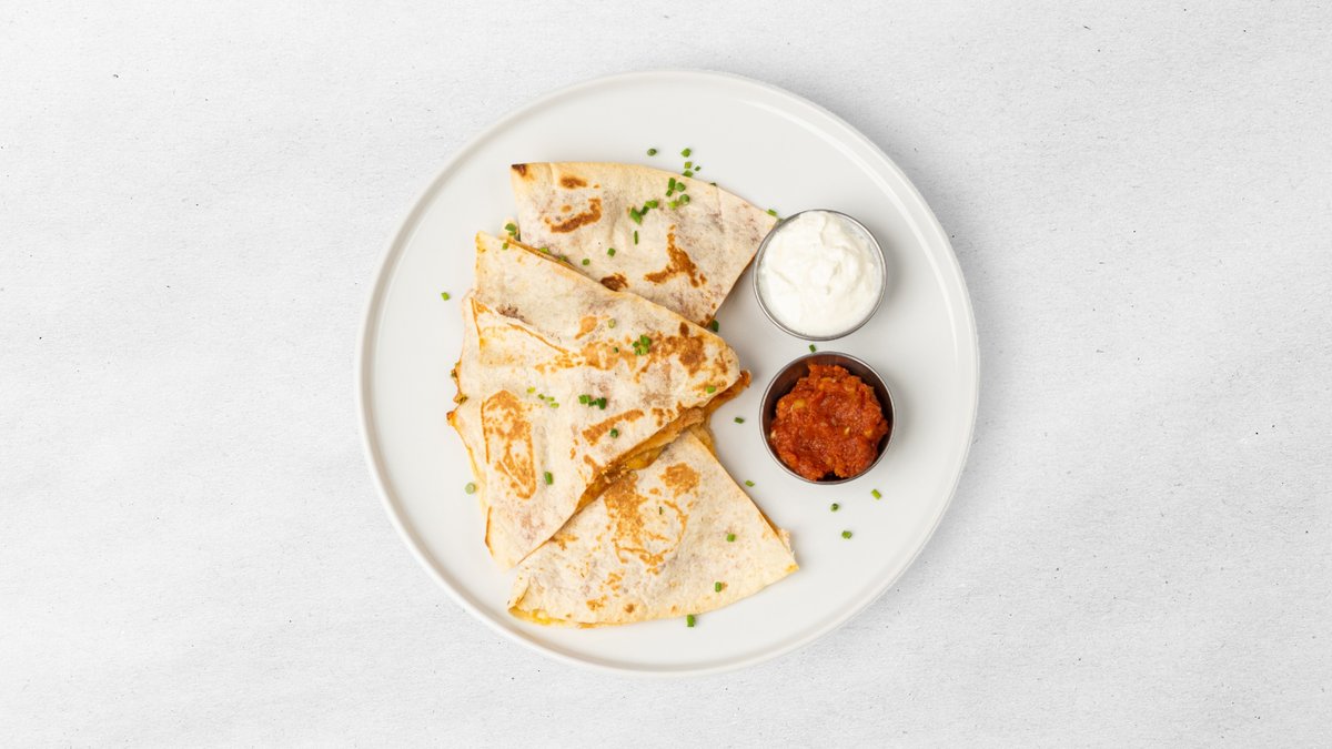Pšeničná tortilla zapečená s grilovaným kuřecím masem, cheddarem, goudou a ementálem s barbecue omáčkou se zakysanou smetanu a pálivou salsou