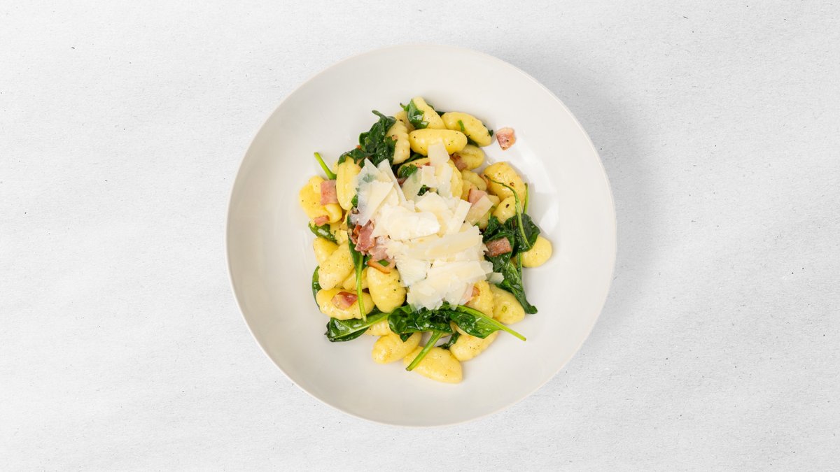 Bramborové gnocchi s vyzrálou slaninou, listovým špenátem a parmezánem s čerstvou pažitkou
