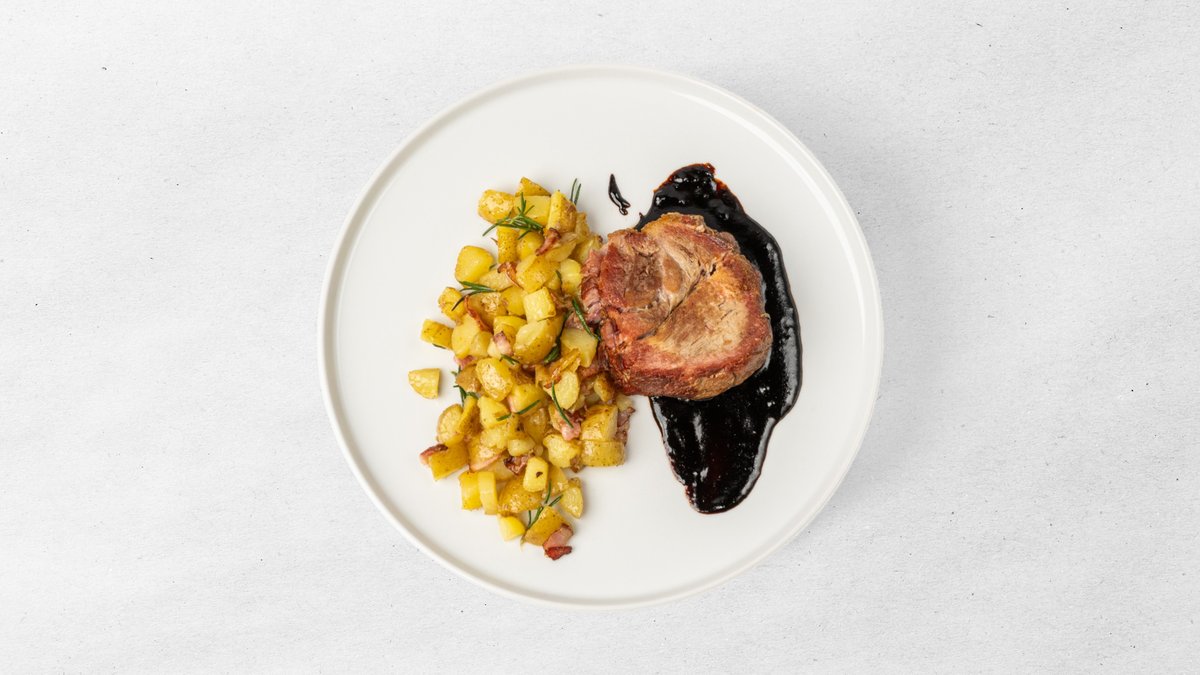 vepřová krkovice marinovaná v hrubozrné hořčici, konfitovaná na rozmarýnu a česneku s omáčkou demi-glace a tyrolským bramborem (200g)