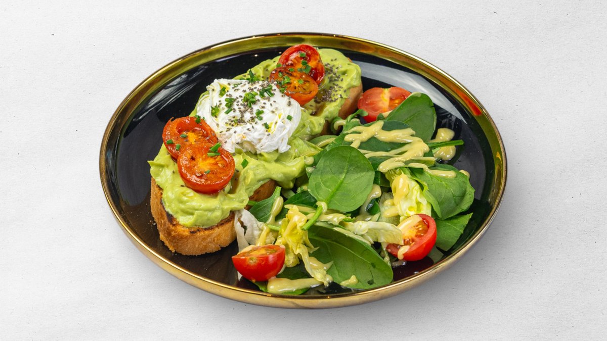 Naše specialita: Avokádo, anglická slanina, poširované vejce, karamelizovaná cibule, jogurtovo-hořčicový dip, listový salát s medovo-hořčičným dresinkem. Alergeny: 1, 3, 7, 10