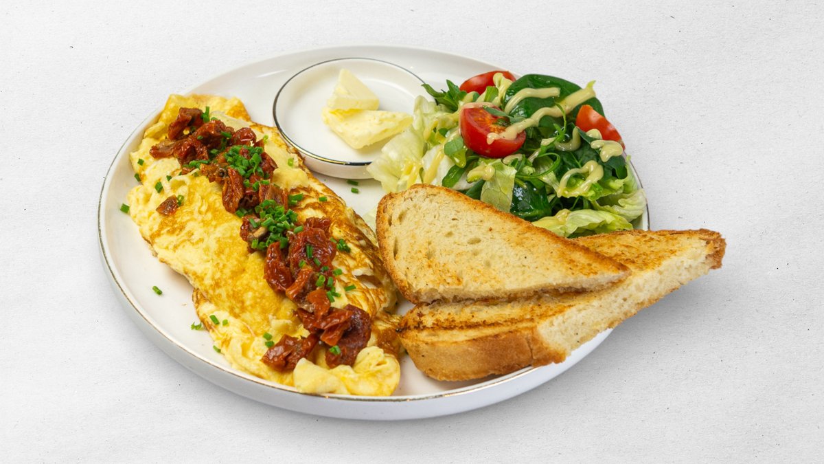 3 vejce, sušená rajčata, kozí sýr, listový salát s medovo-hořčičným dresingem, máslo, domácí chléb. Alergeny: 1, 3, 7