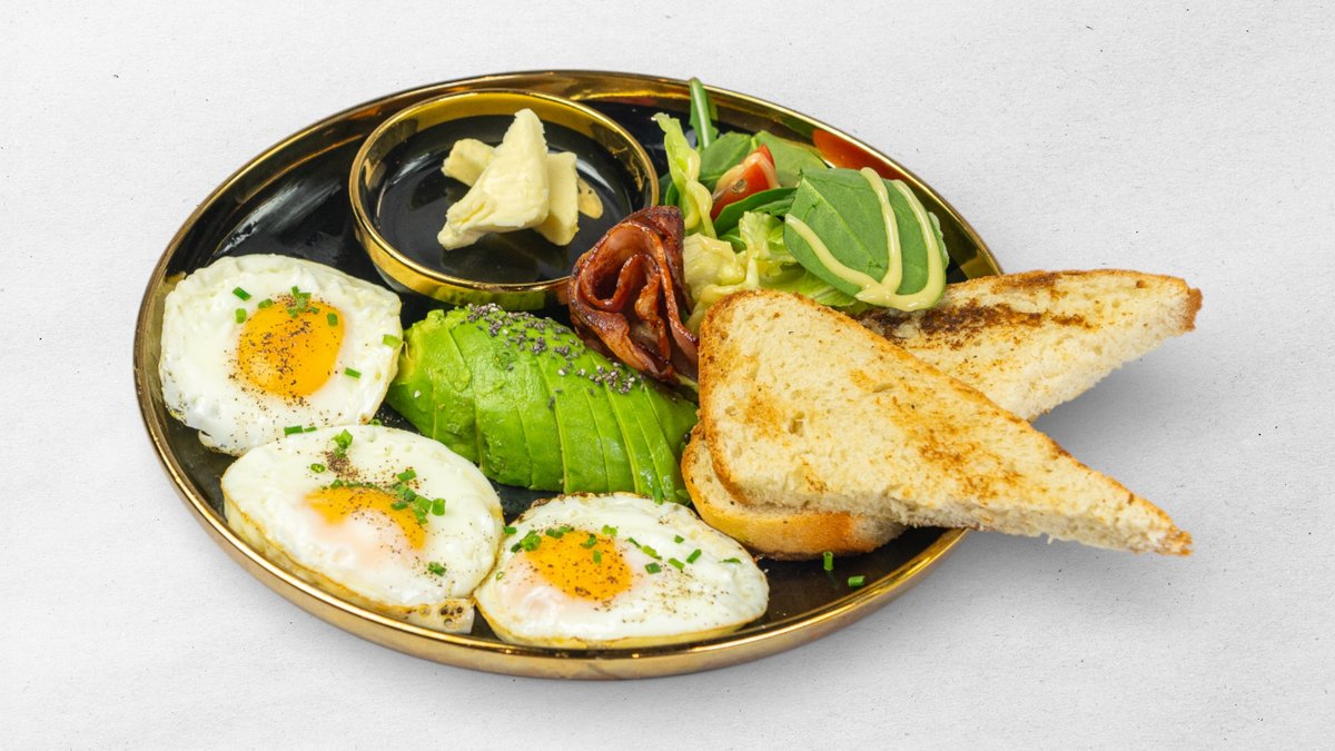 3 vejce, anglická slanina, pažítka, grilovaná cherry rajčata, ½ avokáda, listový salát s medovo-hořčičným dresingem, máslo, domácí chléb. Alergeny: 1, 3, 7