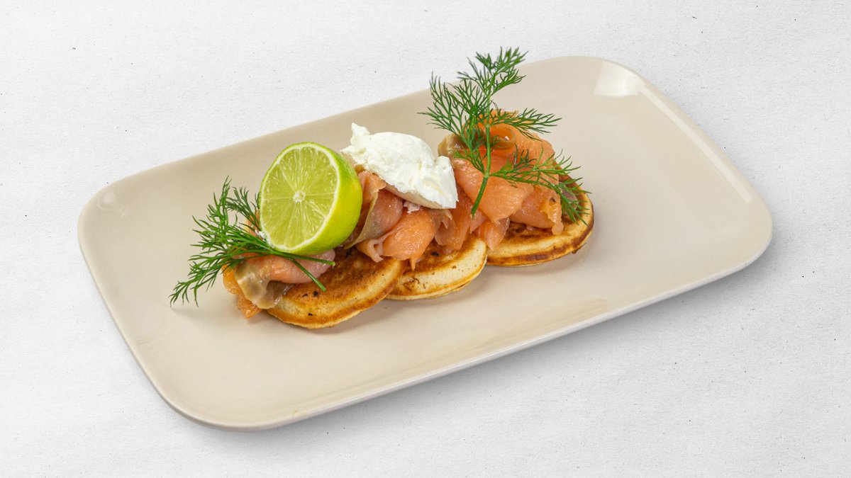 3 lívance, uzený losos, crème fraîche s limetkou, kopr. Alergeny: 1, 3, 4, 7