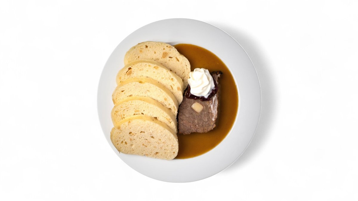 Složení: pečená hovězí kýta 100g (hrubá váha 150g), omáčka, brusinky, houskové knedlíky