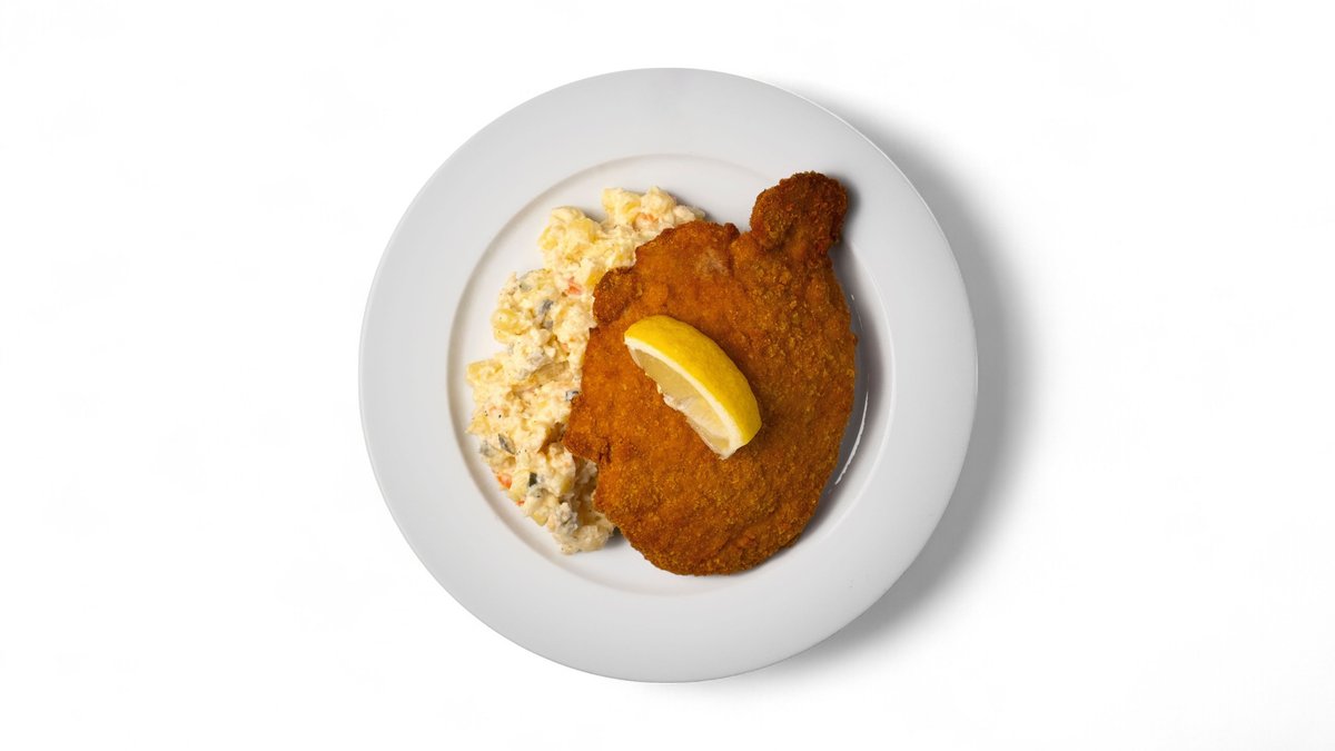 Složení: Smažený obalený kuřecí řízek (2 ks) 130g (hrubá váha 200 g prsního řízku),, bramborový salát 250 g