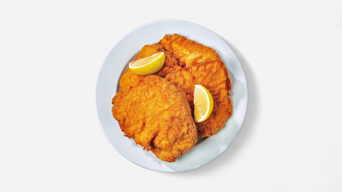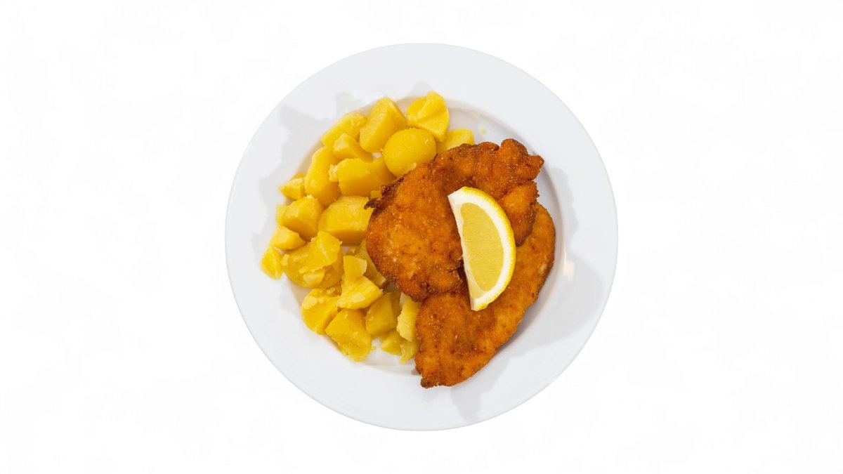 Složení: Smažený obalený kuřecí řízek (2 ks) 130g (hrubá váha 225 g prsního řízku), vařené brambory s máslem 250 g