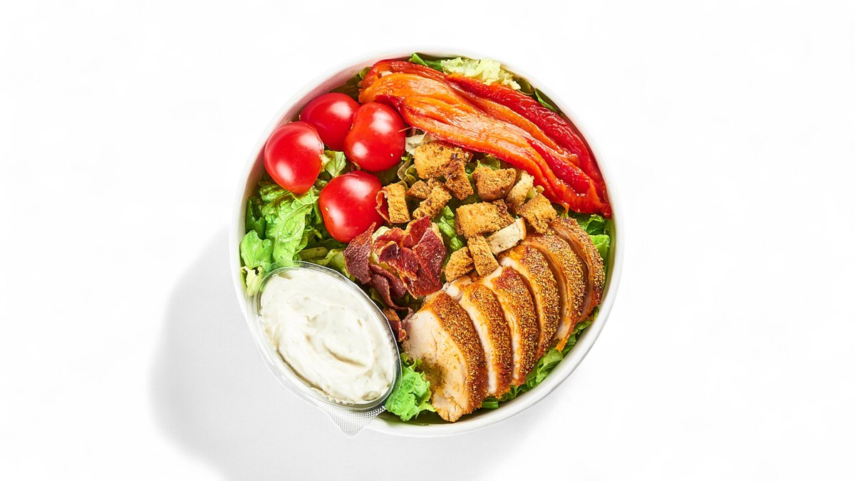 Složení: Kuřecí prsní řízek 100 g (hrubá váha 150 g), římský salát, slanina, krutóny, caesar dresink, ančovičky, česnek, majonéza, sýr Gran Moravia. Víha porce 300 g.