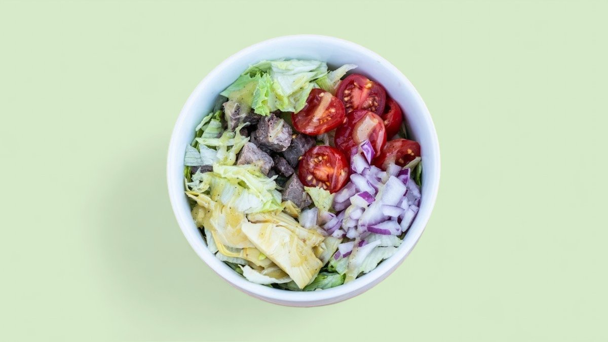 🌽 🥛 💪 Ledový salát, kořeněné plátky hovězího steaku, cherry rajčata, červená cibule, artyčoky