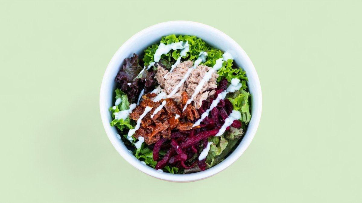 💪 Mesclun salát, tuňák, cherry rajčata, vejce, marinovaná červená řepa