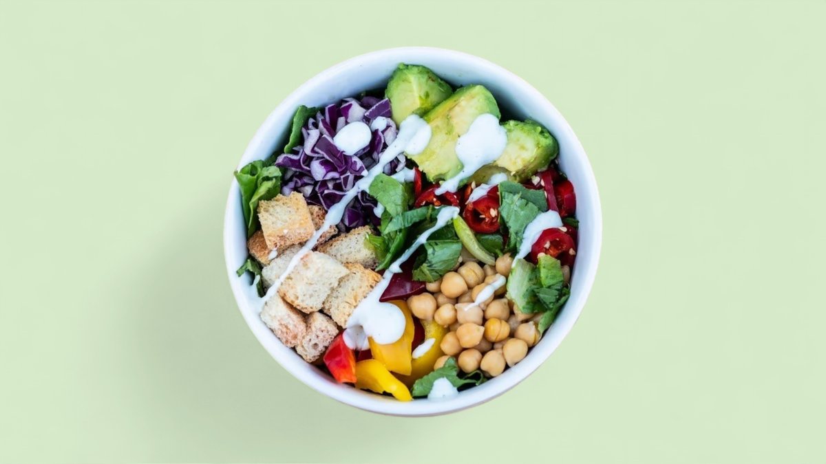 🥛 🌿 💪 Ledový salát, červené zelí, avokádo, feferonky, cizrna, paprika, pikantní krutony
