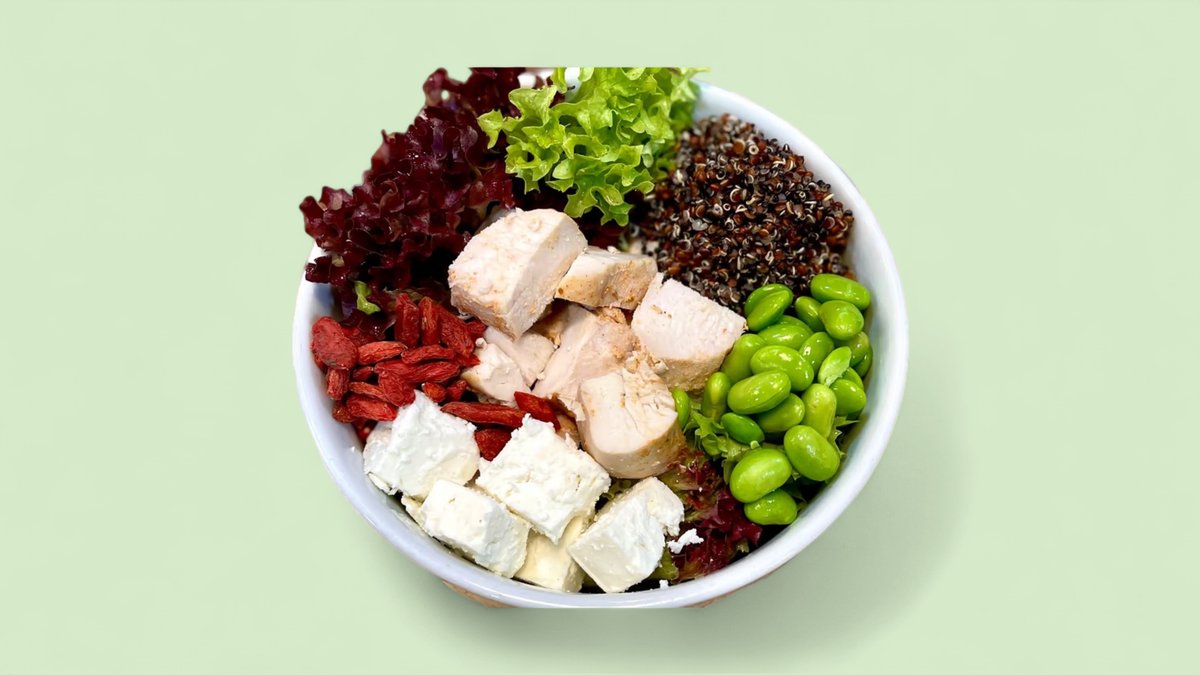Mesclun salát, kořeněný kuřecí prsíčka, feta sýr, kustovnice, edamame, quinoa