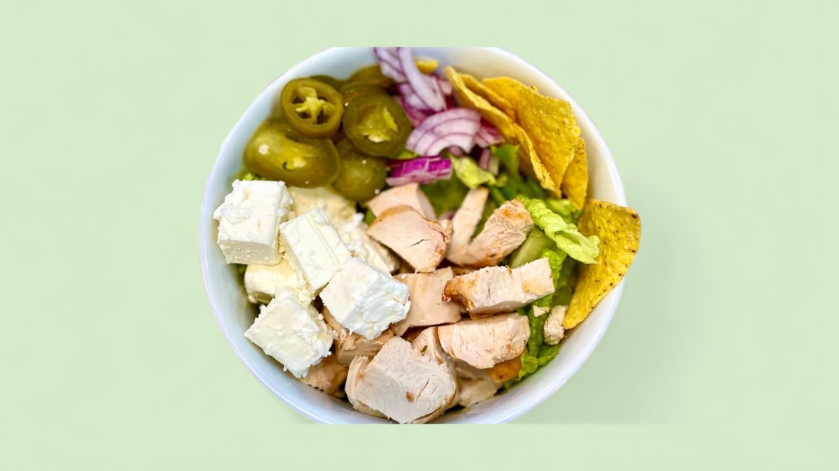 Grilovaná kuřecí prsíčka, sýr feta, jalapeňos, červená cibule, tortilla chipsy, římský salát