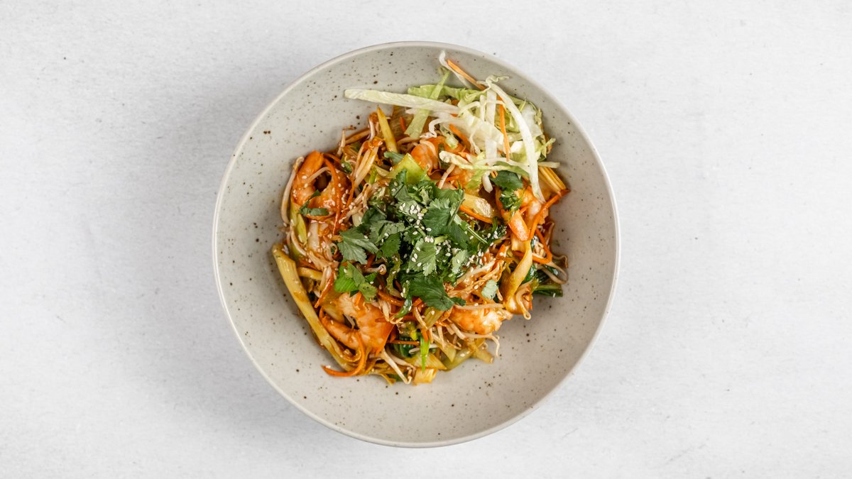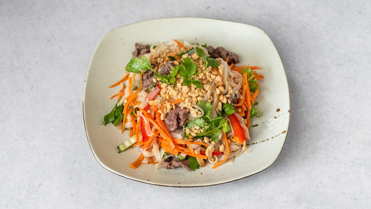 restované rýžové nudle se zeleninou, vajíčkem a masem na thajský způsob doplněné suchým čili, arašídy a citrónem A3, A5 stir fried rice noodles with egg, vegetables and meat based on a Thai recipe - dry chilli, peanuts and lemon on side A3, A5