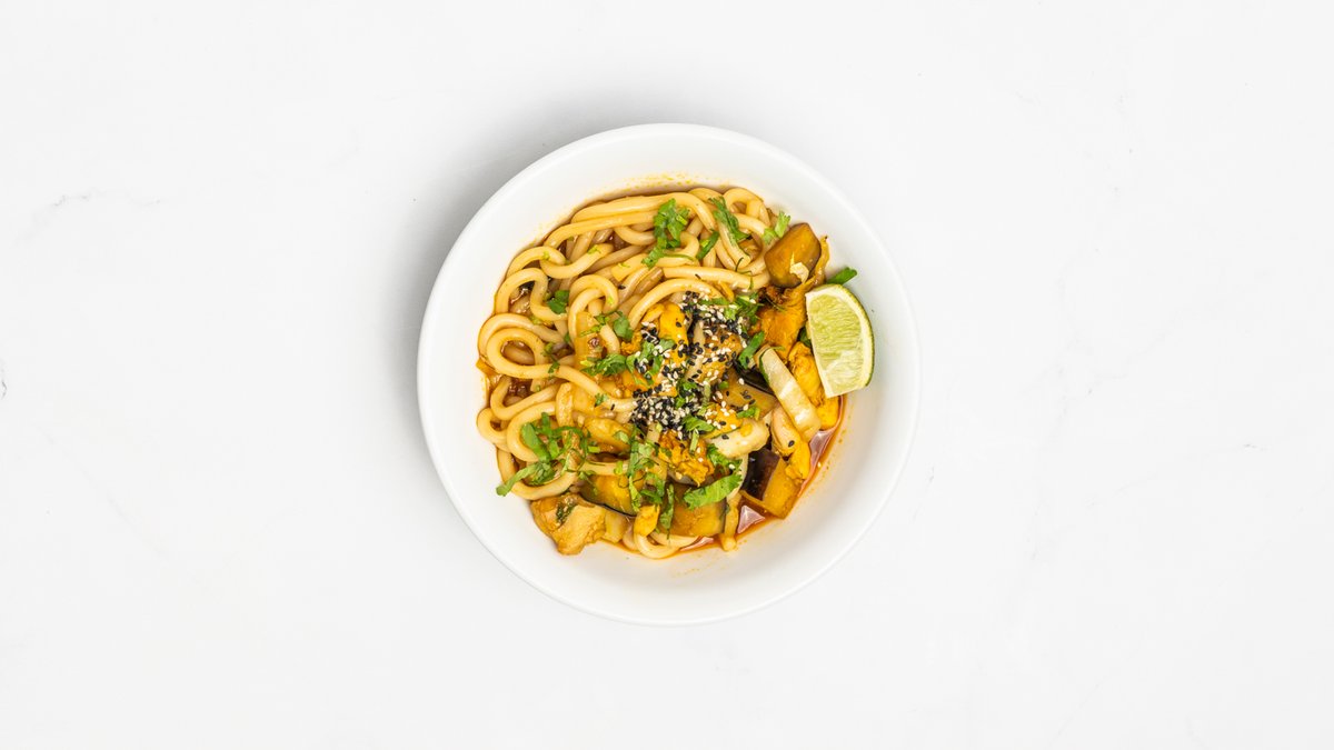 Indonéská polévka se žlutým kari, skleněné nudle, houby, smažená cibulka, vajíčko, koriandr, jarní cibulka A1, A3,A7 Indonesian soup with yellow curry, glass noodles, mushrooms, egg, fried onions, coriander, spring onions A1, A3,A7