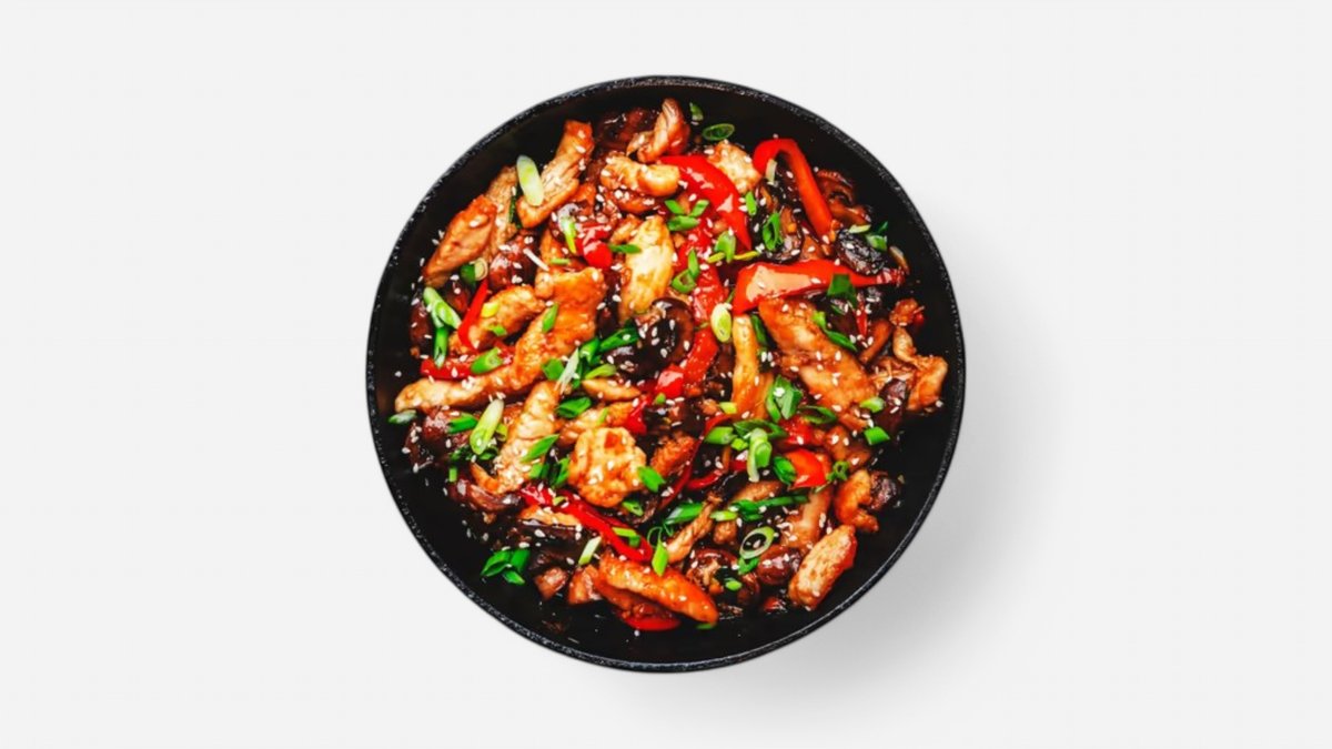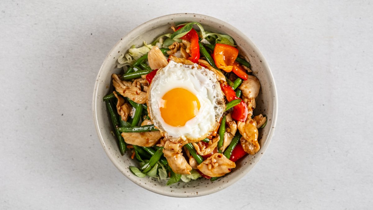 pikatní restované maso na thajský způsob s česnekem, thajskou bazalkou, čili a zeleninou podávané s rýží a volkým okem A3 spicy strir fry meat with vegetables, garlic, thai basil and chilli served with rice and sunny side egg A3