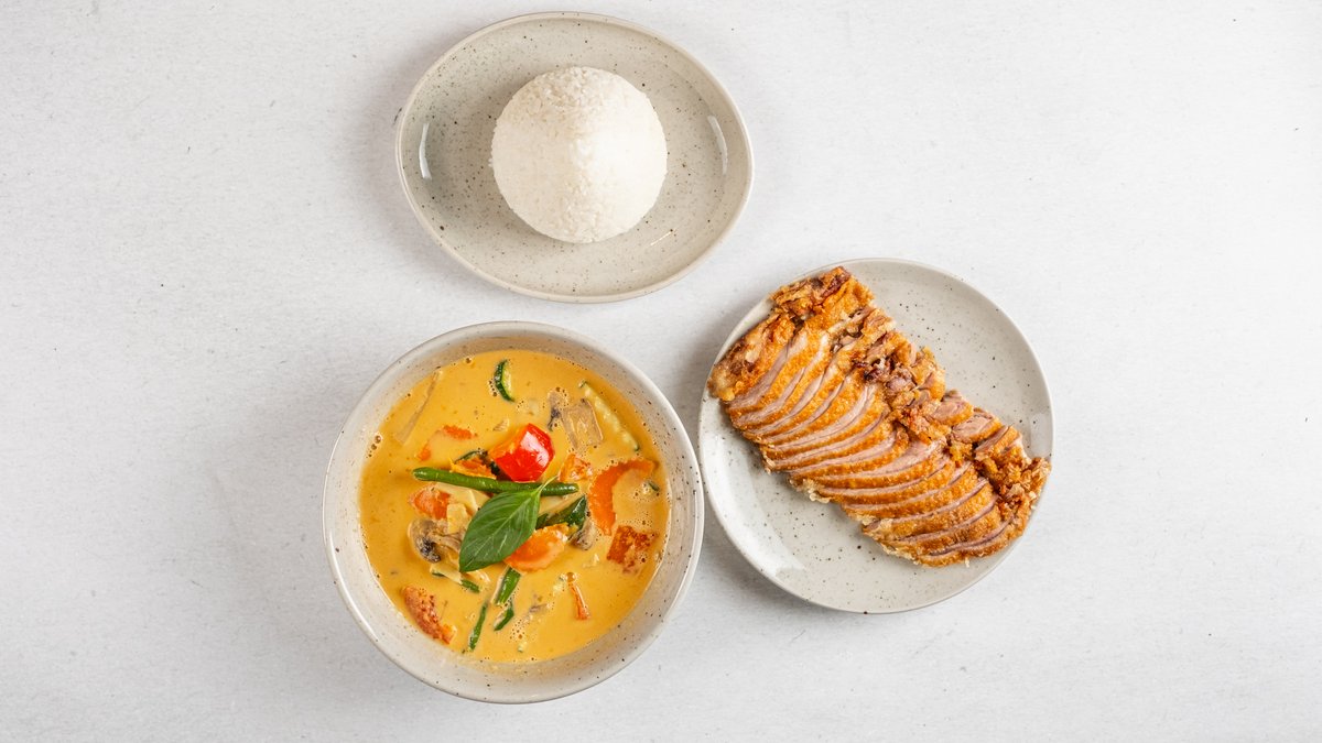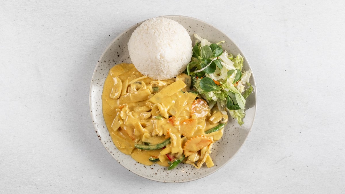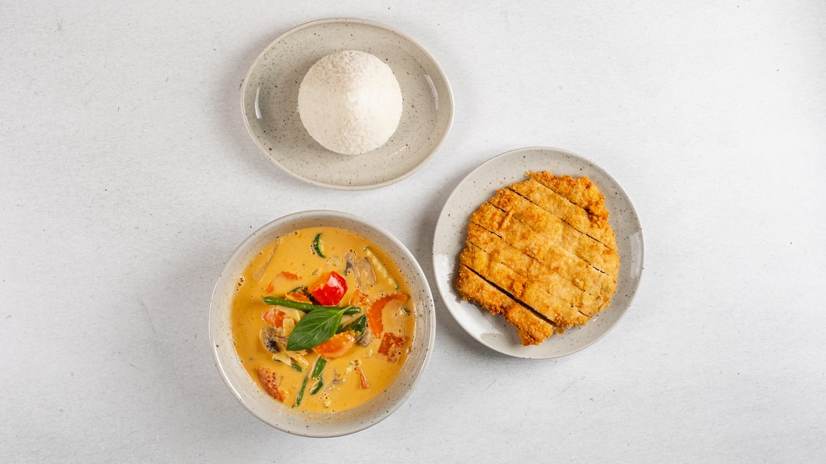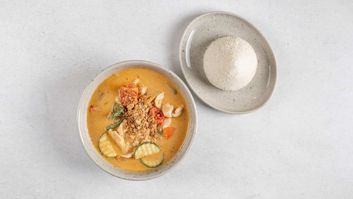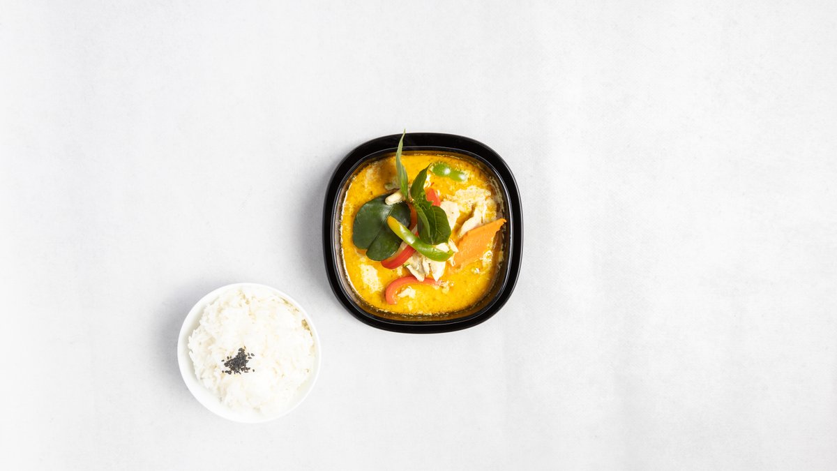 Thajské kari s kokosovým mlékem, zeleninou, thajskou bazalkou a masem položené navrch podávané s jasmínovou rýží Thai curry with coconut milk, vegetables, thai basil and meat on the top served with rice