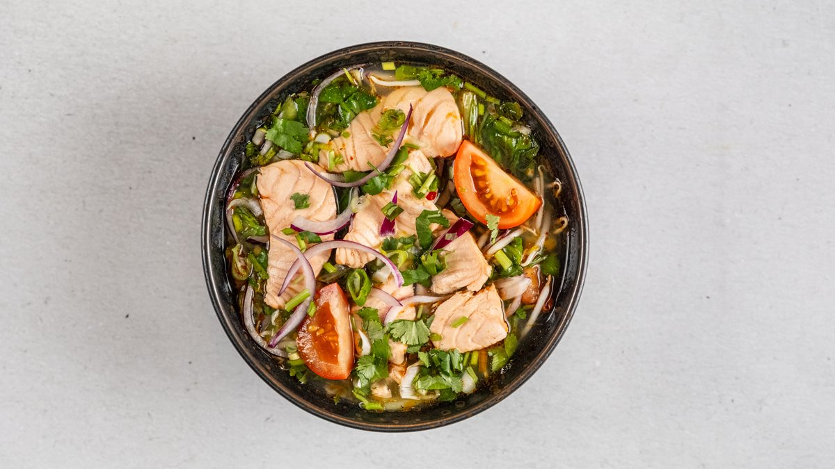 pikantní polévka se zeleninou, kuřecím masem, vajíčkem a jarní cibulkou spicy vegetable soup with chicken, egg and spring onions A3