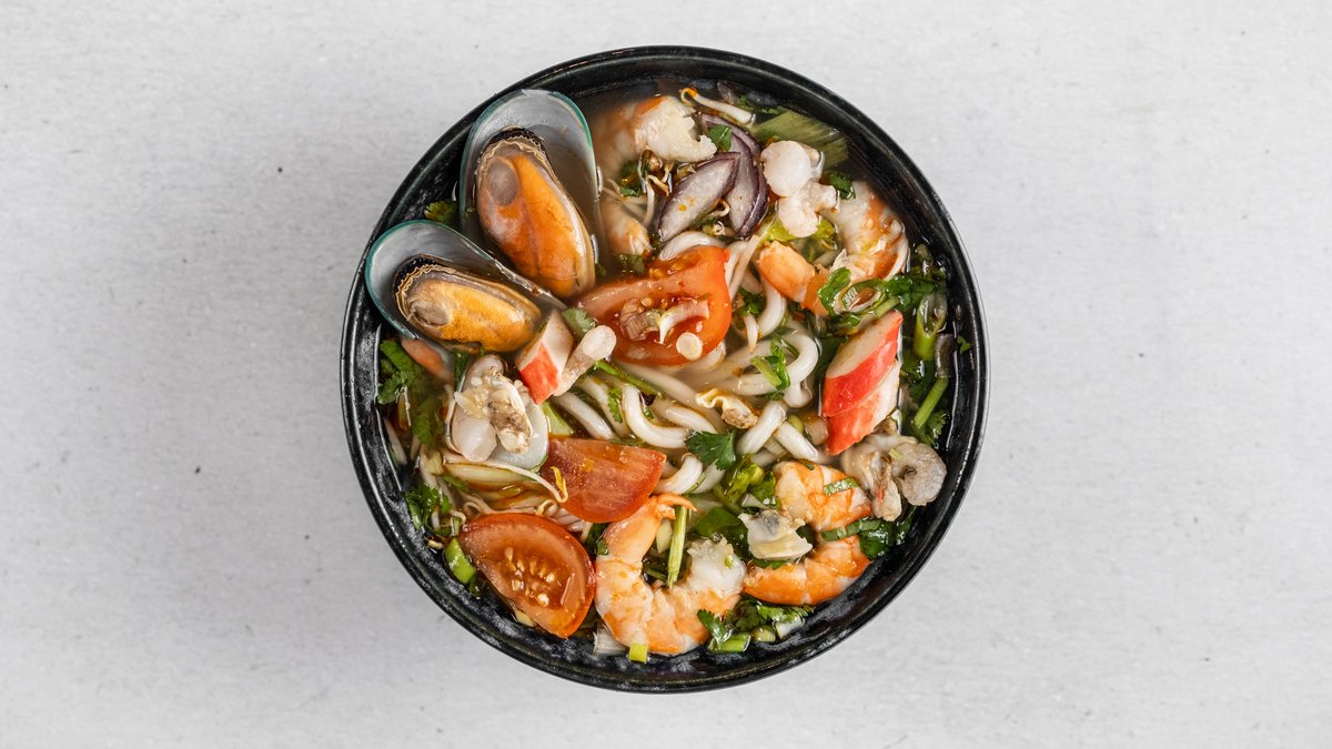 pikantní thajský vývar, kokosové mléko houby, rajčata, citrónová tráva, limetový list, koriandr, jarní cibulka spicy shrimp broth, coconut milk, mushrooms, tomatoes, lemon grass, lime leaf, coriander, spring onion A2