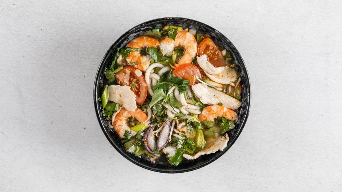 tradiční vietnamská polévka se silným vývarem, rýžové nudle, sojové klíčky, koriandr, jarní cibulka, červená cibule traditional vietnamese soup with strong broth, rice noodles, soybean sprouts, coriander, spring and red onion