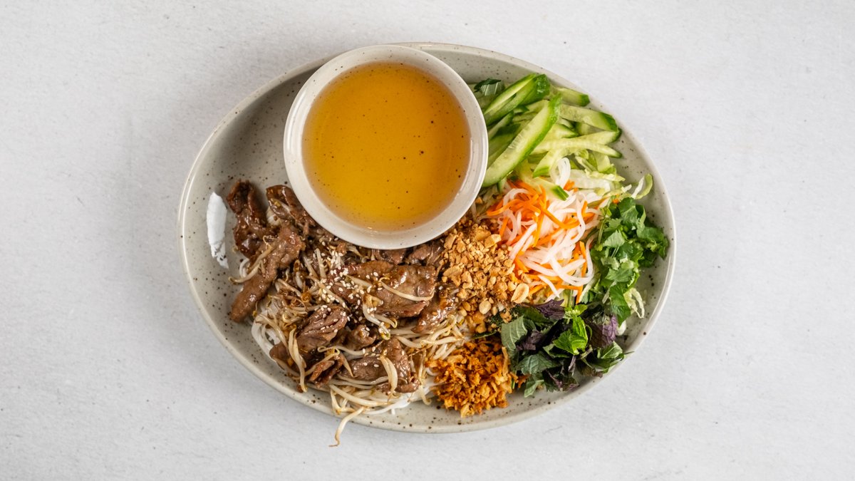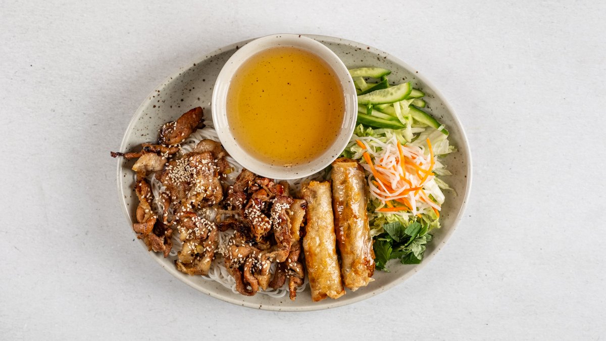 rýžové nudle s grilovanými plátky vepřového bučku, čerstvým salátem a bylinkami podávané s vietnamskou rybí omáčkou A4, A11 Vietnamese grilled pork with rice noodles, salad and herbs with vietnamese fish sauce A4, A11