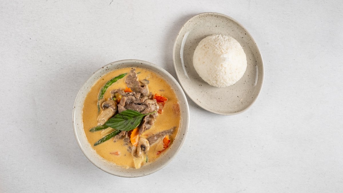 Thajské kari s kokosovým mlékem, zeleninou, thajskou bazalkou a masem podávané s jasmínovou rýží Thai curry wıth coconut milk, vegetables, thai basil and meat served with rice
