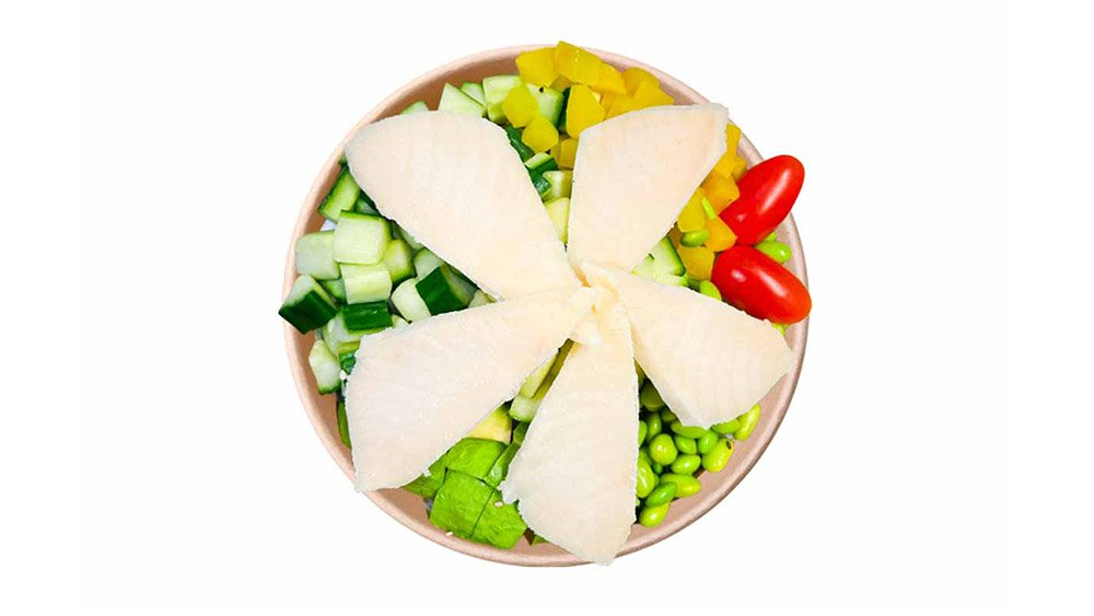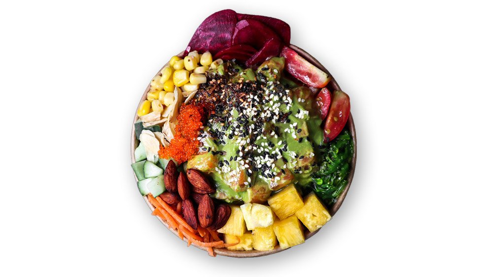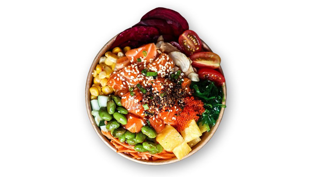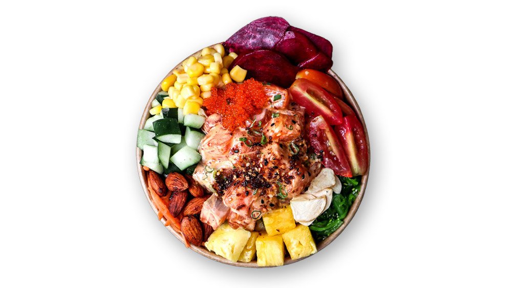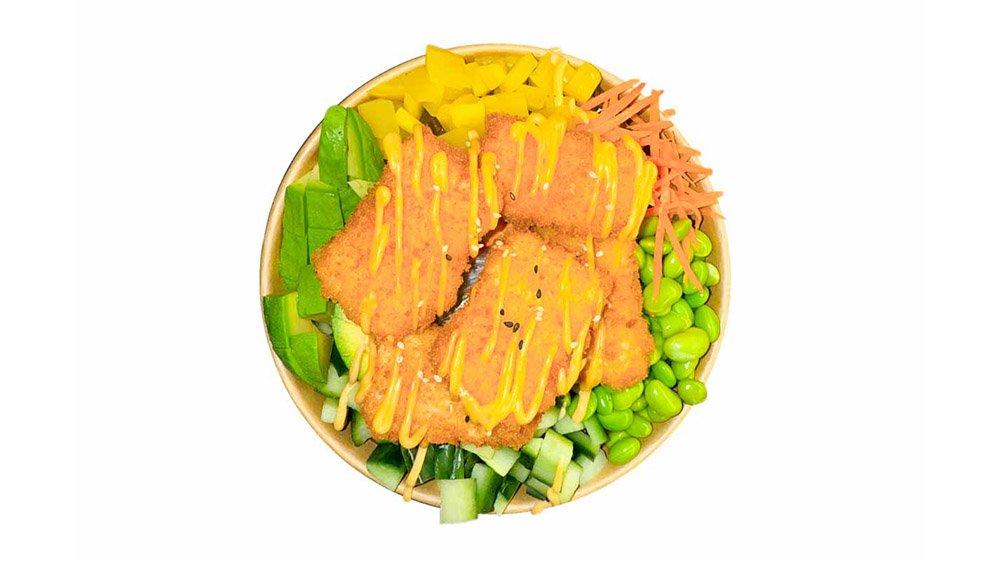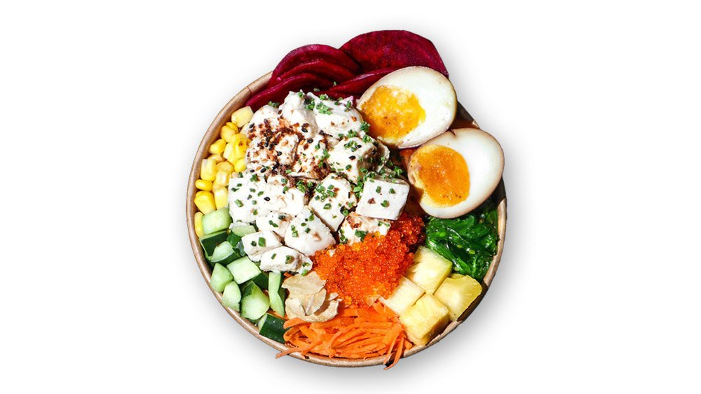 550 g, Sous Vide Dashi kuře s nakládaným vajíčkem ramen a prémiovou polevou. Sushi rýže, 7 lahodných přísad (okurka, řasa wakame, mrkev, cherry rajčátka, medový ananas, kukuřice a nakládaná červená řepa). Signature Umami Drizzle omáčka, koktejlová majonéza, smažená cibulka.