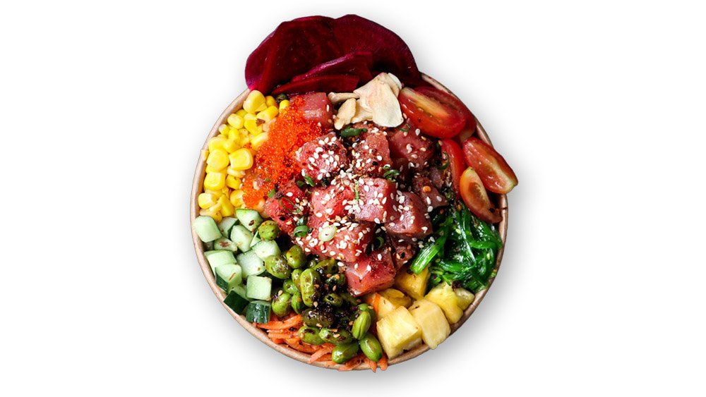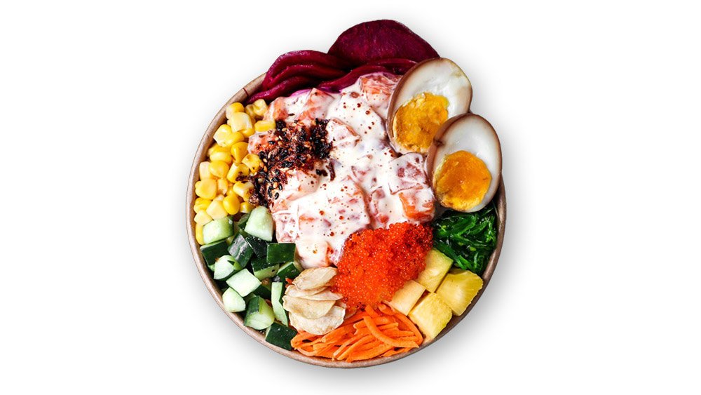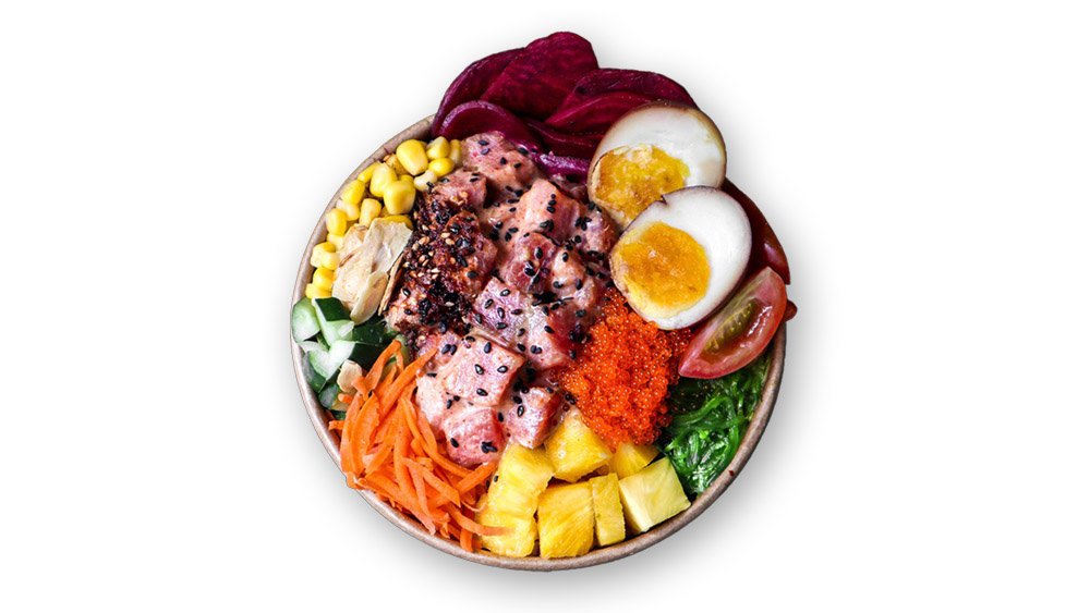 550 g, tuňák s wasabi majonézou a nakládaným vajíčkem ramen. Sushi rýže, 7 lahodných přísad (okurka, řasa wakame, mrkev, cherry rajčátka, medový ananas, kukuřice a nakládaná červená řepa). Signature Umami Drizzle omáčka, posyp kaviár (Tobiko).
